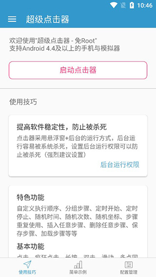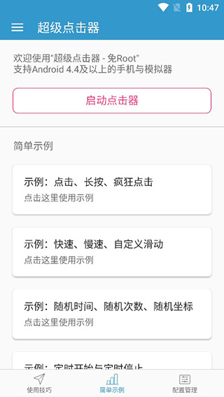 很多用户在使用一些热门应用的时候,往往会不停点击屏幕,如果保持一个长时间的点击操作那么对于用户而言也是一种负担,所以小编为你准备了一个非常不错的程序,它就是超级点击器6.0高级版,这个工具为用户提供了非常强大的点击管理功能,让用户可以通过这个程序实现你对各种应用的点击模拟,特别是一些游戏应用程序,往往一些活动就需要玩家不停点击,所以通过这个超级点击器官方版用户就可以模拟点击解放双手,不仅如此,这个工具不需要ROOT,所以用户安装和使用都会变得非常方便,而且加入了脚本录制的功能用户可以将一些常用的程序操作方式以脚本的形式进行录制,帮助你更好地使用各种应用程序,那么各位用户,赶快下载安装这个app,为你提供最好的程序点击模拟服务吧。