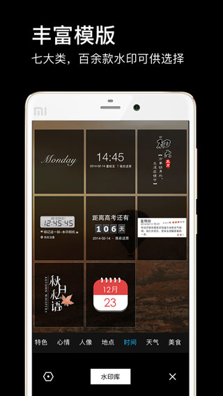 4、丰富的水印类型:心情、天气、美食、地点、时间5大类31款不同特色的水印。