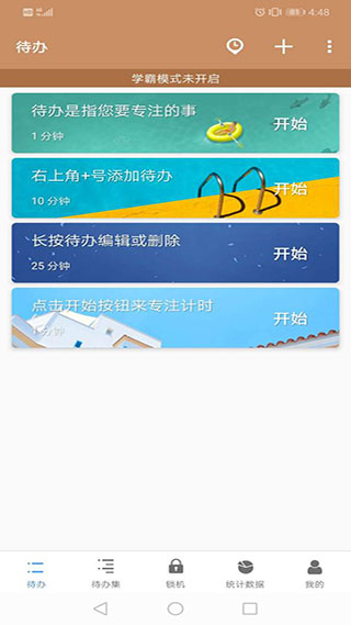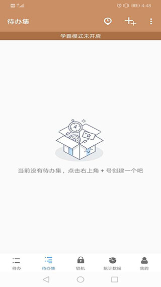 2、点开就会看到界面最大模版有很多可以待办,进入番茄ToDo,点击右上角“+”即可添加待办,你可以选择计时方式、时长等。你也可以选择添加 待办集,并选定颜色进行区分。待办集可以将一个大事项进行细分