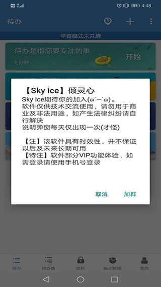 7、学霸模式模式打开并且计时后会阻止其他APP的打开,严格模式计时开启后不能暂停,提前完成可取消,并且计时开始后拦截其他APP的消息,避免打扰。但是也可以设置白名单,避免错误拦截
