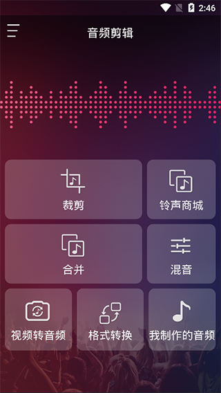 1、进入到音频裁剪大师的主页之后,大家可以从中找到自己需要的功能,音频剪辑大师提供了:音乐裁剪、音乐合并、音乐混合、音乐提取、格式转换等功能。