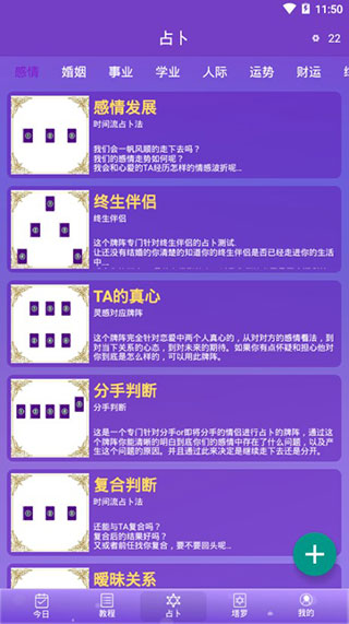 如果你对占星比较感兴趣,那么小编为你准备了一个非常有趣的掌上应用程序,它就是塔罗牌占卜app最新版,这个程序为用户提供了掌上占卜的功能,用户可以在这个程序中,通过AI程序的智能占卜功能,去测算你今天的运行,你可以打开程序随机抽一张塔罗牌,通过对塔罗牌的解读,用户就可以了解到一天的运势,而且这个程序还为用户加入了像是恋爱、健康、财运、婚姻等多方面的占卜预测功能,保证用户可以通过这个程序搞定关于你自己的多方面测算需求,不仅如此,这个塔罗牌占卜app最新版更是加入一些占卜书籍的阅读内容推送,让用户可以在无聊的时候,通过这个阅读推送的功能,让你可以更好地了解各种各样的占卜知识,比如星象方面的和命理方面的趣味解读,赶快试试这个app吧。