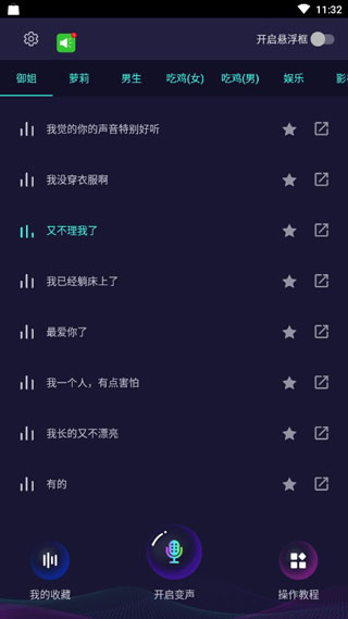 5、悬浮窗功能,让你轻松实现微信、QQ等聊天软件中的变声,各种游戏中变声也是不在话下。更多好玩的功能等你来慢慢发掘。