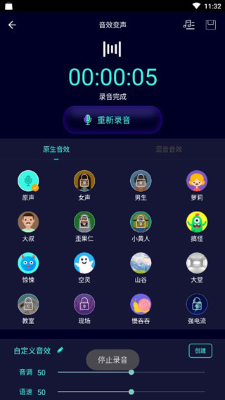 拥有多种变声效果,包括“萝莉”、“大叔”、“外国人”、“机器人”等,让你的声音变得百变多样;