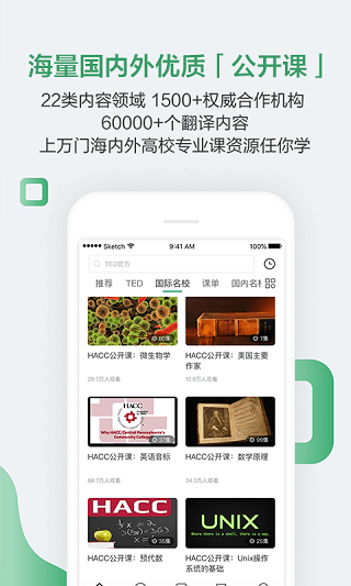 作为中国最大最全的课程视频平台,拥有来自国内外顶尖学府的海量名师名课,覆盖文学艺术、历史哲学、经济社会、物理化学、心理管理、计算机技术等二十多个专业领域;作为TED官方合作伙伴,向国内用户提供最新最赞的TED演讲;引人入胜又发人深省的纪录片、轻松易学的可汗学院,无数好内容就在这里等着你。