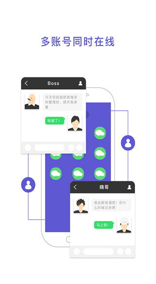 4、多个账号同时在线,可多开N个微信,QQ,微博,游戏……手机里的一切软件,不错过任何一个账号消息!