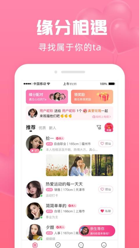 欲寻同调人,还向此中觅。这款寻她app宛如一座精心构筑的社交桥梁,致力于帮你跨越茫茫人海,精准找到灵魂契合的挚友或伴侣,让期待中的缘分不再遥不可及。该平台对用户资料进行严格审核,从源头杜绝虚假信息与恶意骚扰,为每一次真诚的社交点击筑牢安全防线,让用户无需担忧,放心开启交友之旅。这里的互动体验丰富多元,各类玩法如同春日繁花般竞相绽放。无论是充满趣味的问答比拼,让智慧与幽默碰撞火花;还是敞开心扉的情感畅谈,为心灵寻觅共鸣;亦或是别出心裁的趣味挑战,增添互动的欢乐氛围,都让交流告别单调,充满惊喜与期待。同时,平台内的话题内容包罗万象,从细腻的情感心得分享,到实用的交友秘籍探讨,应有尽有,助力用户在交流中收获理解与认同,找到情感共鸣。不仅如此,寻她交友软件还拥有简洁直观的操作界面,无需复杂学习,轻轻一点便能轻松畅游社交世界,让交友过程更加省心省力。该软件不仅是寻觅一位契合的伴侣,更是开启一段走心的情感旅程,帮助你在茫茫人海中,遇见那个真正懂你心思、与你灵魂共鸣的知音。