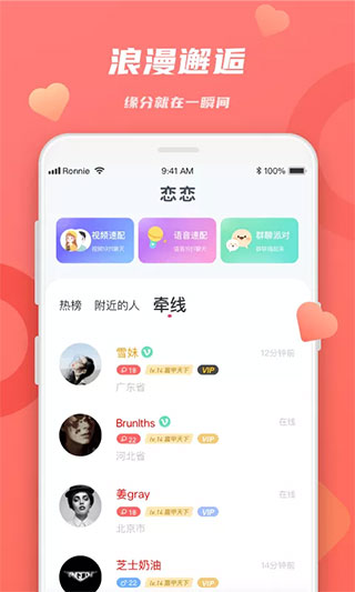 惜惜情怀心底绕,悠悠爱意梦中寻。这款恋恋app作为专注于浪漫邂逅与甜蜜情感交流的社交平台,秉持 “让爱触手可及,为你牵系良缘” 的理念,为渴望寻觅真爱、拥抱浪漫的用户,搭建一座充满惊喜与温暖的爱情桥梁。无论你是偏爱宅在家中享受独处时光,还是热衷踏上旅途探索世界,在软件中,只需指尖轻轻一点,就能跨越社交的重重壁垒,迅速触达那个令你心动的人。从最初的陌生问候,到产生心动的奇妙感觉,或许就在转瞬之间,让交友变得轻松又高效。平台的多元互动方式,为用户带来了丰富且沉浸式的社交体验。高清流畅的视频畅聊,让你能面对面感受对方的神情与温度;温柔细腻的语音呢喃,传递着文字难以表达的情感,而趣味 PK 与情感广播功能,更是不断制造出惊喜满满的心动瞬间,让每一次互动都充满新鲜感。更值得一提的是,恋恋app还打造了一系列独特玩法。邂逅抛绣球玩法,充满浪漫与未知,或许一次不经意的 “接球”,就能开启一段奇妙缘分;拜师收徒玩法,则让用户在交友过程中既能收获知识与成长,也能建立深厚的情谊,让交友不再局限于表面交流,而是充满深度与期待。而且该软件还汇聚了众多高颜值主播,他们用才华与魅力点亮直播间,也有无数真诚的倾诉者,在这里分享生活点滴、吐露内心故事。无论是热闹非凡的群聊,与众人畅谈欢笑,迅速炒热气氛,还是私密温馨的一对一私语,诉说心底最柔软的话语,都能满足你不同的社交需求。