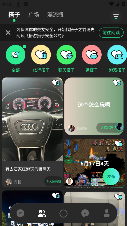 搭伴同行山水路,游踪共绘日月章。这款搭游app以 “让每一次出行都有合拍旅伴,让每段游踪都留下共同印记” 为理念,为热爱游历、渴望结伴的用户,打造一处盛满奇遇与欢笑的结伴天地。该平台通过卡片机制甄选推荐,每张卡片都像封装着一个有趣灵魂的 “缘分盲盒”,左滑跳过、右滑喜欢,简单操作间让投缘的人一触即通,喜欢就点个赞传递好感,心动了就直接开聊分享心情,无需复杂流程,缘分就在指尖流转。附近搭友功能如同灵敏的 “搭子雷达”,智能呈现周边兴趣相投的伙伴,让那些擦肩而过的契合身影不再被错过,随时可以组局共赴一场电影、一次探店,将线上的默契延伸到线下的精彩瞬间。无论是突然想找人临时约饭,分享街角新开的宝藏餐馆;还是想组队游戏开黑,在虚拟战场并肩作战;又或是想参与热闹的兴趣聚会,解锁小众爱好的新玩法,发布邀约都能轻松应对,只需几步操作,就能让乐趣从指尖触手可及。搭游app中动态广场像一个热闹的生活展览馆,有人分享周末徒步的沿途风光,有人记录深夜食堂的烟火气,在这里你可以尽情记录生活点滴、交流感悟见解,在真实的展示中吸引同频的目光。聊天功能响应迅速如即时通讯的桥梁,文字、语音、表情包随心切换,让陪伴不止于冰冷的文字,更能传递语气里的温度与情绪里的起伏。平台更引入真人认证与活体识别技术,如同为社交环境装上 安全滤网,从身份核验到实时验证层层防护,彻底杜绝虚假账号,保障每一次互动都建立在安全与真诚的基础上,让你可以放心展现真实的自己。搭游app不仅让 “找搭子” 这件事变得妙趣横生,更用简单直接的方式打破社交壁垒,让人与人之间的连接如同流水般自然,水到渠成。