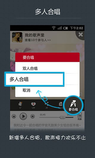 4、合唱(双人深情对唱、多人合唱随心唱)。