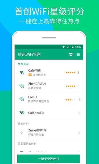 腾讯wifi管家app实时监测手机WiFi安全、主动防御风险WiFi,推送可靠安全WiFi,钓鱼网、虚假WiFi通通不用怕!