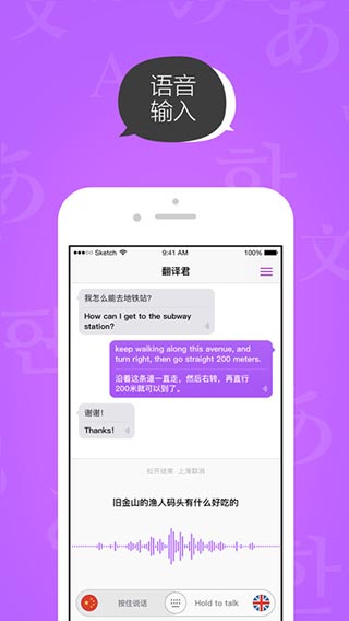 翻译君app采用了领先的语音识别和翻译引擎技术,自动判断当前发音,通过自由会话,模拟真实语境,解决口语练习中无真实对话场景的问题,有效提高语感及纠正发音。