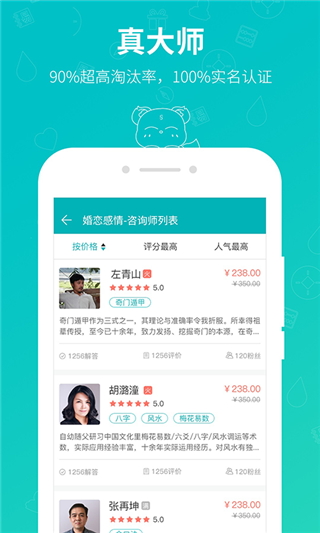 3、集八字算命,算卦占卜、宝宝起名,择吉,风水调理于一体,汇集了精通生辰八字算命、六爻占卜、手相面相、紫微斗数,奇门遁甲,梅花易数等各类术数的权威易学老师。