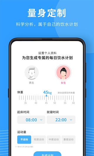 软件会根据您的性别、体重等身体信息,运动量、天气等外界因素,帮您制定科学、健康的每日饮水计划。