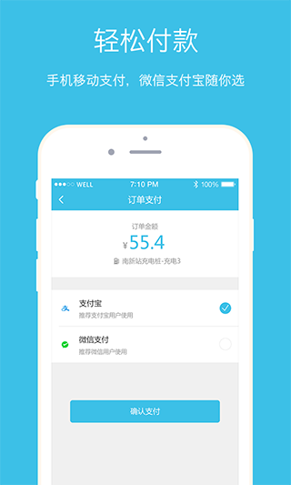 充电完成,直接点击APP支付,可支持微信,支付宝支付,很便捷快速。