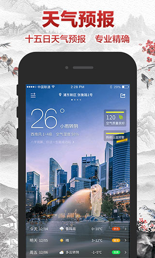 3、天气:天气动态实时更新、未来一周天气、PM2.5污染提醒、紫外线强度提醒;