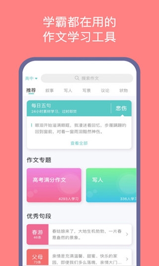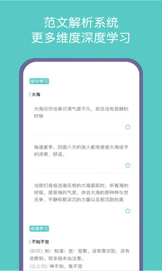在高中语文考试中,作文这个项目占了非常大的分数,如果你想要让自己的孩子能够在这个项目有一个好分数,那么小编为你准备了一个不错的程序,它就是笔神作文app,这个程序为用户提供了非常优秀的范例作文以及历年来高考的相关题目,让你可以通过专家精细的分析说明,让你可以通过这个方式,更好的去了解出图人的意图,并且段落分解的方式,让你可以更好了解关于高考作文书写的技巧和方法,并且这个笔神作文安卓版中还提供了一些优美的诗句,不论是名人名言还故事歌赋你都可以选择加入到你的文章中,往往一些优秀的引用可以为你获得更高的分数,让你可以通过这个程序快速提升自己的写作能力,让你可以在考试的时候,针对写作题目,写出更高分的作为,赶快下载使用吧。
