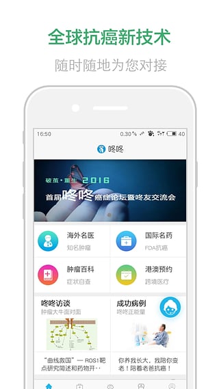 在这里,Get第一手前沿抗癌资讯。顶尖科研团队领衔,为医患带来国内国际第一手抗癌前沿资讯。2015年起咚咚深耕癌症前沿治疗落地与应用,是国内首批接受免疫治疗的癌症患者交流平台。前沿抗癌技术刻入App基因,让你时刻了解最先进的抗癌手段,朝着“治愈”冲刺出发!
