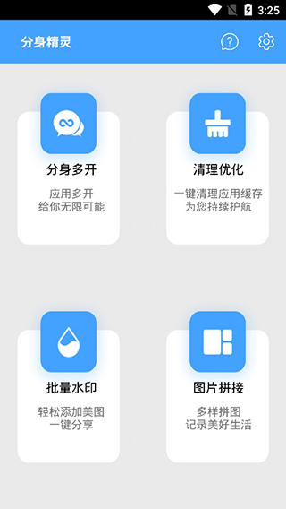 如果你有多个社交账户,并且想要同时接受来自多个账户的信息内容,那么小编为你准备了一个不错的程序,它就是分身精灵,这个程序为用户提供了像是阅读管理的支持功能,让用户可以在这个程序的帮助下,通过后台存放的方式,让你可以同时开启多个重复的应用,而且加入了内存优化的功能,你不用担心因为开启了多个程序导致系统延迟反应缓慢,让你可以因为优化的关系,放心的使用其他程序,比如你可以开启多个微信,然后在接受多个端口的消息同时让你更好的进行日常工作或者娱乐的需求,让你的手机可以同时为你处理多个应用的请求, 让你享受到高速流畅的用户体验,赶快下载安装分身精灵这个APP,让它为你提供最好的应用管理支持,让你的手机更加稳定流畅。