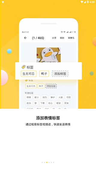 1、添加表情标签,在查找喜欢的表情包时,直接分类查询即可;