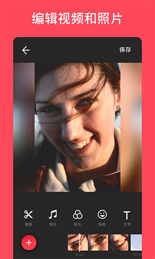 - 为视频和照片添加文字和贴纸,甚至你自己的照片