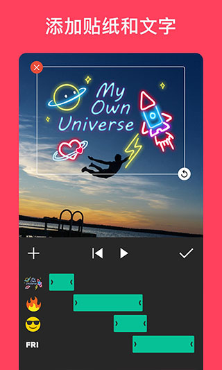 - 文字和贴纸时间轴功能,添加多个文字或贴纸到视频。定位同样非常方便
