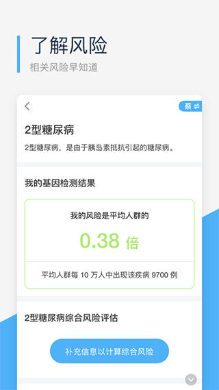 - 健康风险:基因数据时代的养生之道。各种疾病的风险,都可以通过基因检测数据与高标准的科学计算模型进行推测,借此调整您的生活习惯,防患于未然。