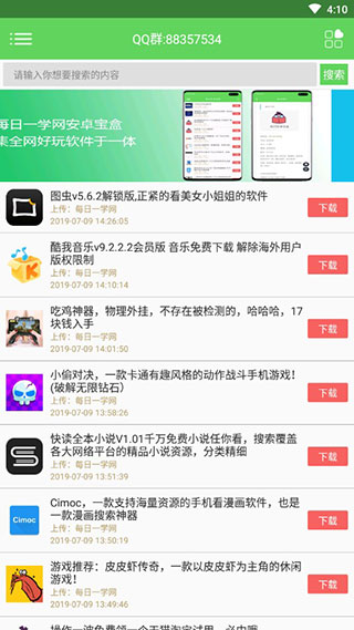 各位安卓系统的手机用户,今天小编为你准备了一个非常优秀的安卓应用市场程序,名叫每日安卓宝盒,你可以在这里找到各种功能的应用,为你的提供最好的应用体验,而且这个程序为用户加入了像是应用推荐的功能,让用户可以每天都能看到这个市场中上线的新应用程序,让你可以在这里找到你最喜欢的应用类型,并且这个每日安卓宝盒加入了像是用户留言板块的功能,你在下载任意应用程序之前,你都可以在这里看到用户对于这个应用的留言评论,这些评论中不乏一些对于使用体验的感想,让你可以使用之前就有所了解,这样子用户就可以判断应用的内容,避免下载到一些垃圾的应用程序,所以各位用户不要错过这个程序,赶快下载安装,让它为你提供最好的应用程序管理帮助,赶快行动吧。