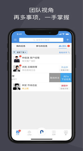 1、任务管理:随时随地了解团队成员任务进程,及时解决任务中的问题。