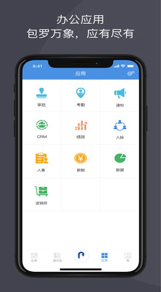 3、审批:多功能审批,请假、申购、出差等,何时何地都可快速处理,实现电子化办公。