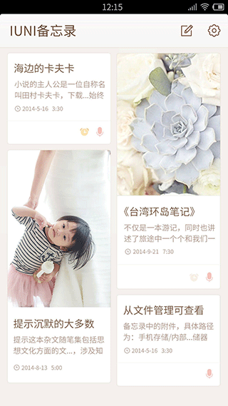 1、IUNI备忘录手机版拥有多种不同的备忘工具,在编辑页面栏中提供视频、图片音频等插入工具;