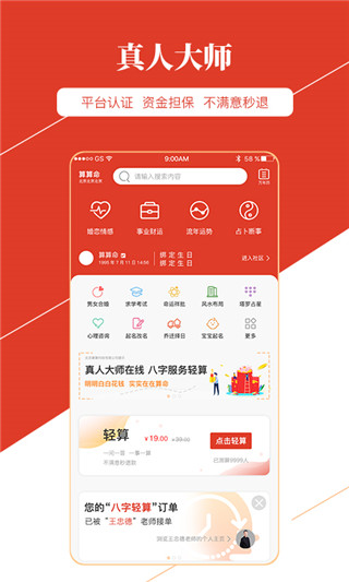 3、大师测算:多位专业的大师真人测算,包括婚姻爱情测算、周公解梦、车牌号码测算、起名测名、星座运程、性格测试等;