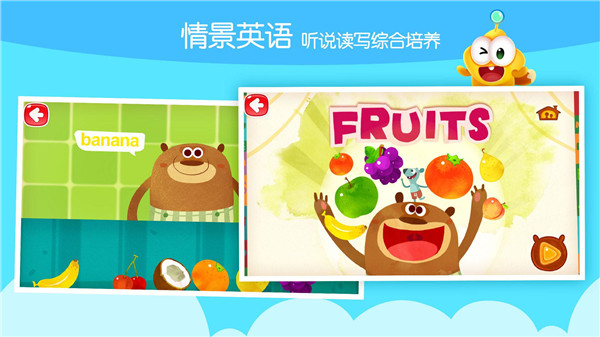大量动画、儿歌,让孩子大量地听英语发音,结合互动游戏TPR教学法,鼓励孩子多听、多说,主动运用英语进行交流。