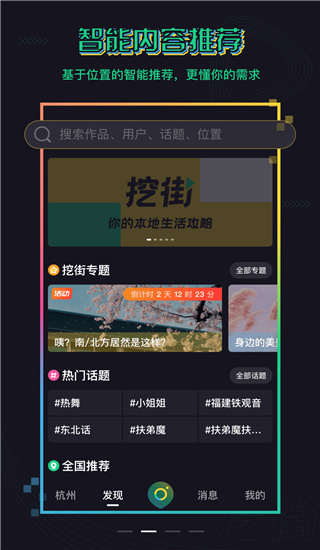 随着网络短视频文化的流行,很多网友都通过各种各样的短视频社交平台分享了个人生活,而小编为你推荐挖街APP,这个平台是现在比较热门的一个优质视频社交平台,为用户提供了优秀的一个分享视频的社区支持,你可以使用手机拍摄精彩视频以后,发布到平台之中,而且加入了便捷的辅助制造功能,用户可以在视频加入个人水印,或者是加入各种精致的片头片尾内容,让你的短视频内容更加充实,并且这个挖街app还为用户提供了交流评论专区,你可以在观看他人视频的时候,对视频内容进行点赞,让优质的视频可以被更多的人看到,并且这个程序还为用户提供了像是城市视频推荐的功能,开启这一功能之后,用户可以看到更多地方城市的相关视频推荐,帮助你了解更多城市生活内容,赶快使用吧。