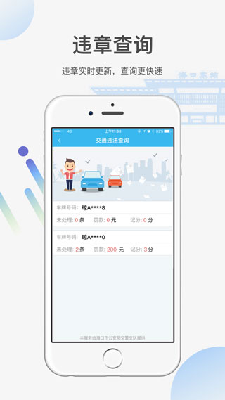 1、便民服务:违章查询、便捷挪车、安全出行、电话防诈骗查询、身份证查询;