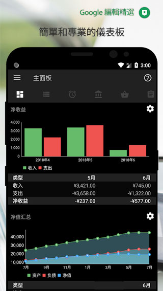该软件最初吸引我的便是它遵循 Material Design 的简洁图标和操作界面了。打开 App 进入的主界面是近期的财务状况总结,包括每日汇总、预算汇总现金流汇总等等,通过简单的操作,可以打开菜单,也可以选定某一图表进行详细查看。而横向滑动则可以选择不同的标签。